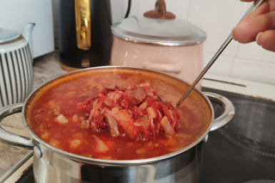 Добавьте сваренную и промытую фасоль, готовьте ещё 7 минут. Затем положите грецкие орехи, чеснок, острый перец, хмели-сунели, зелень и соль. По желанию добавьте другие специи по вкусу.