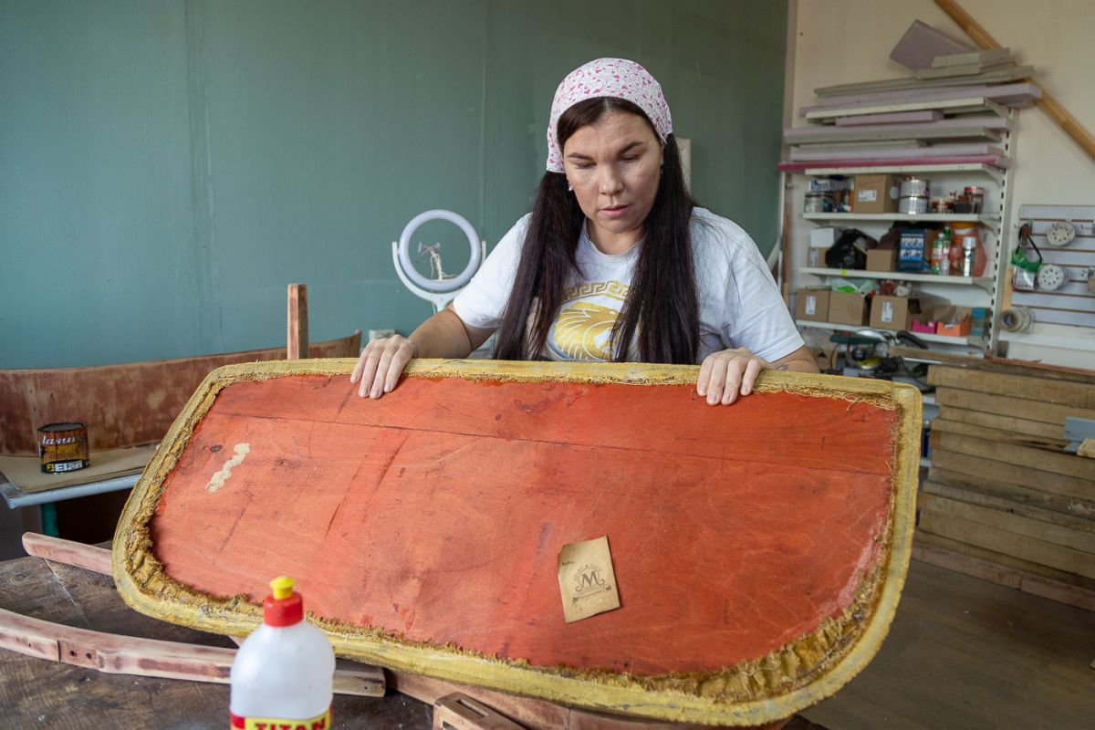 Сегодня Ксения Ханина — самозанятый предприниматель. Она не просто ремонтирует мебель, а дает старинным вещам вторую жизнь. В ее мастерской уже побывали предметы без малого с вековой историей. Сейчас на столярном столе — советская кушетка 50-х годов. Проекты реставрации Ксения разрабатывает самостоятельно.