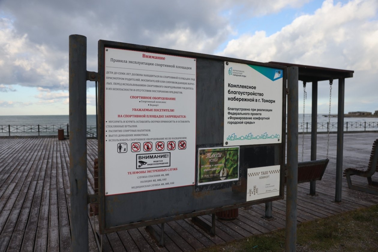 Сейчас на пляже в Томари обустроена спортивная площадка и деревянный настил, установлены качели, скамейки и столики, обновлен мурал с названием города. Предусмотрен санитарный модуль и мусорные контейнеры, заасфальтирована парковка. По просьбе жителей сделаны ограждение и спуск к воде.