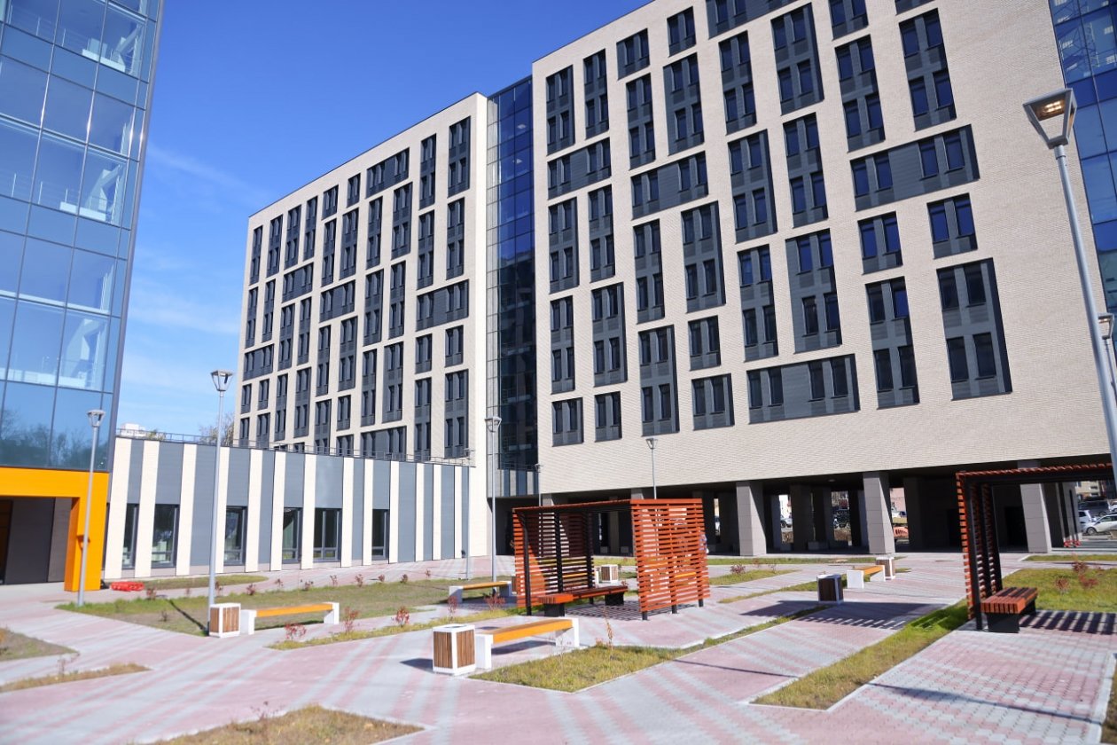 Студенческий городок на 1500 мест на проспекте Победы состоит из трех восьмиэтажных корпусов. Их объединяет стилобат — общее архитектурное основание, где уже функционирует тренажерный зал. В ближайшем будущем здесь откроют кафе, административный и медицинский блоки, прачечную самообслуживания и коворкинг. В дальнейшем в студгородке откроют и детский сад с группами присмотра.