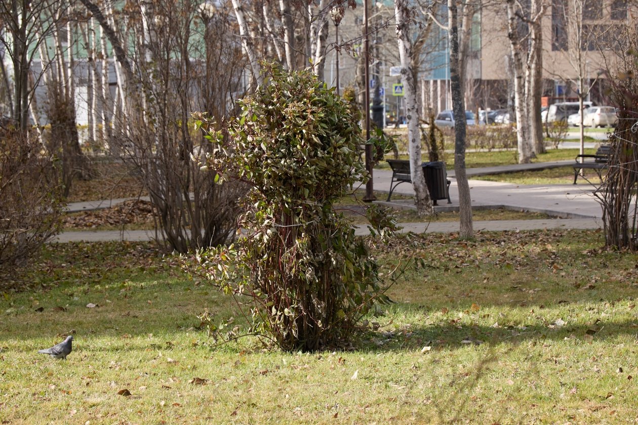 В рамках осенних работ специалисты "Зеленого города" трудятся над созданием надежной защиты для растений. Кустарники аккуратно связываются, а живые изгороди получают специальные укрытия.