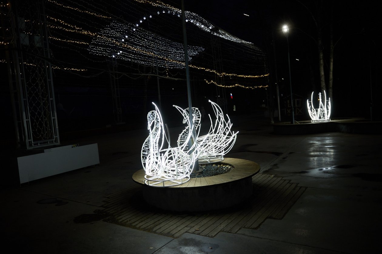 В этом году для посетителей подготовят два катка: малый и большой. Они будут расположены на стадионе "Космос". На основной территории продолжается установка светящихся инсталляций и декоративных фигур. Также будет создан ледовый городок, включающий ледовые и снежные композиции.
