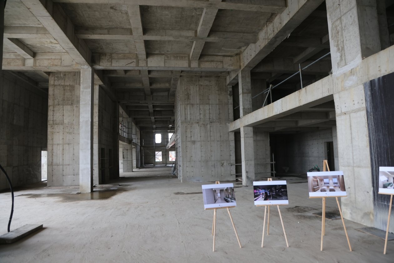 Рядом продолжается возведение девятиэтажной пятизвездочной гостиницы общей площадью более 39 тысяч "квадратов". Рабочие на объекте завершают финальные монолитные работы. Комплекс предусматривает 584 номера различного класса, автостоянку, фитнес-зал, ресторан, открытую террасу с летним садом и площадку с открытыми бассейнами.