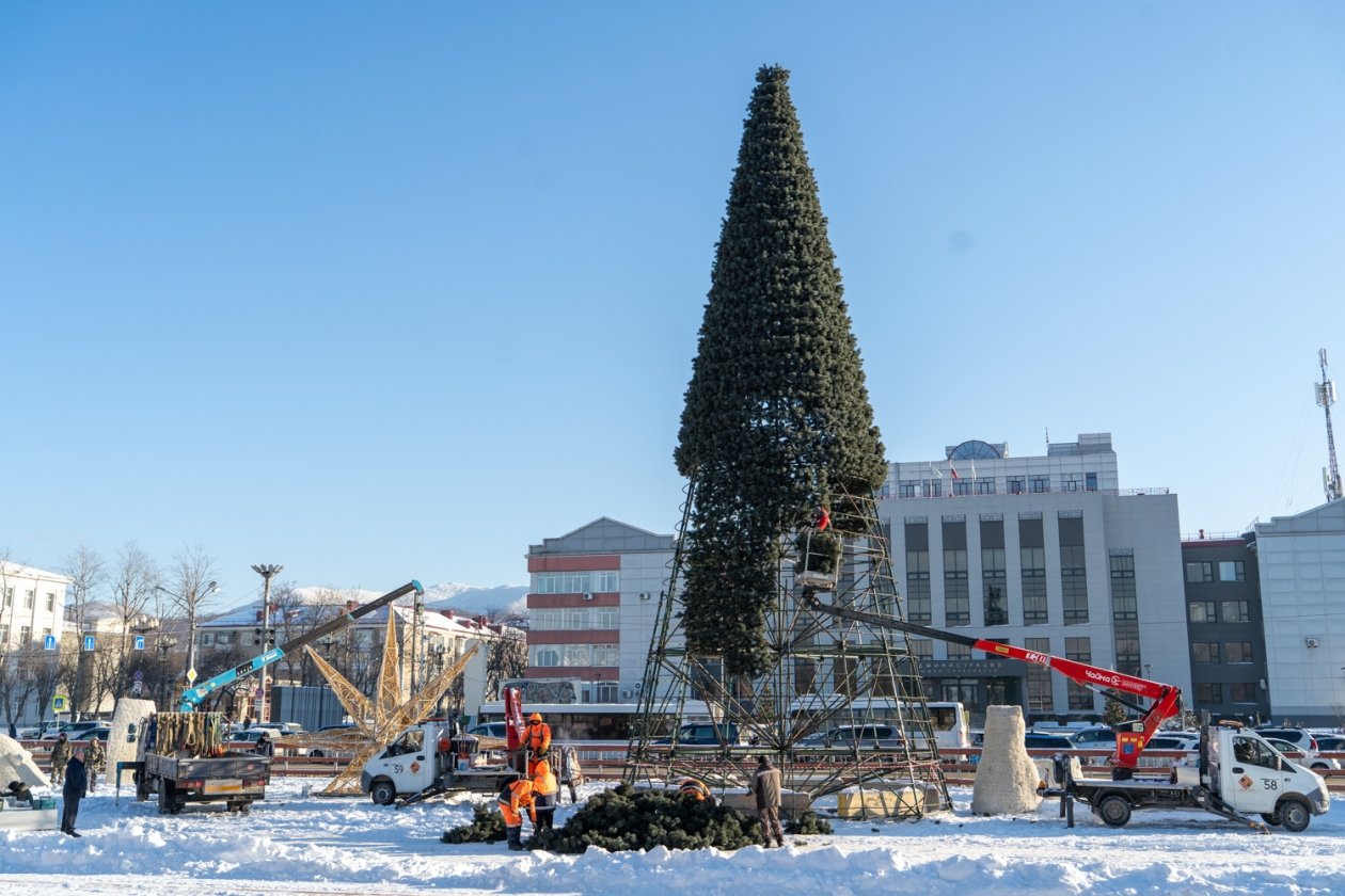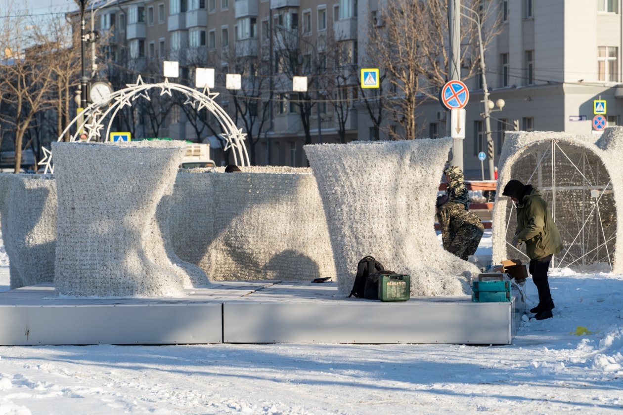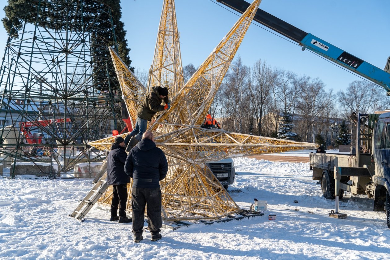 SakhalinMedia, 4 декабря. Установка праздничных объектов в преддверии Нового года продолжается в Южно-Сахалинске. Сегодня монтаж арт-объектов проводится на площади Ленина, сообщает пресс-служба администрации города.