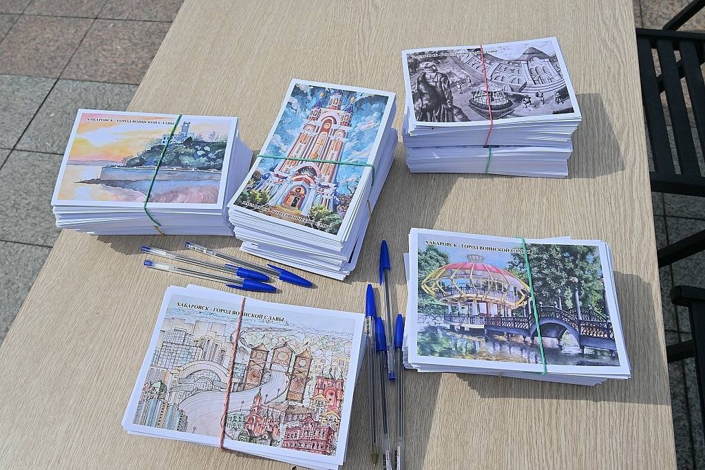 — Мы долго готовились к этому дню, — рассказала начальник управления культуры администрации города Ирина Жолобова. — Юные художники рисовали любимые места города, лучшие рисунки и стали эскизами для открыток. Всего изготовлено 5 видов открыток по 1000 штук с разными достопримечательностями Хабаровска.