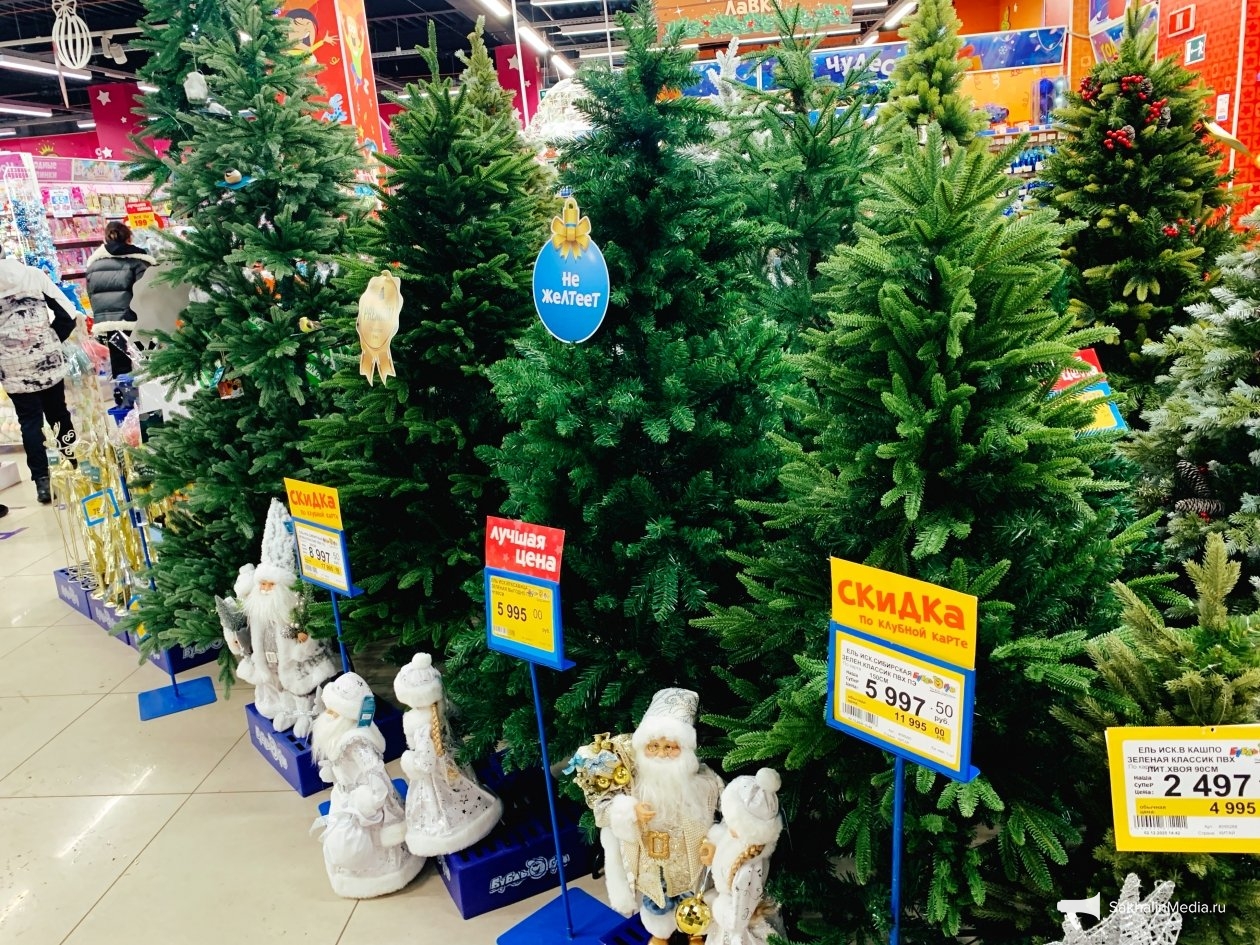 В одном из магазинов сети детских супермаркетов представлен довольно широкий выбор елок: высокие и низкие, "заснеженные" и обычные. Для тех, кто предпочитает компактные варианты, есть деревца высотой 120 сантиметров — они обойдутся примерно в тысячу рублей. Елки высотой полтора метра можно приобрести чуть больше, чем за 6 тысяч рублей.