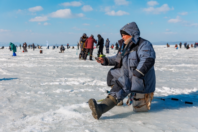 Рыбак, рыбалка, зимняя рыбалка, навага, улов. Фото: Денис Таушканов, ИА SakhalinMedia