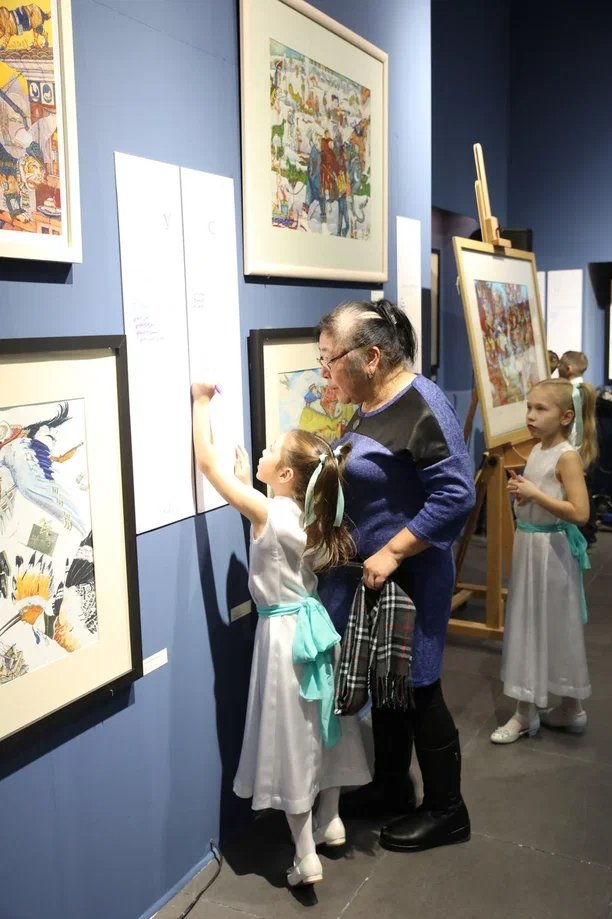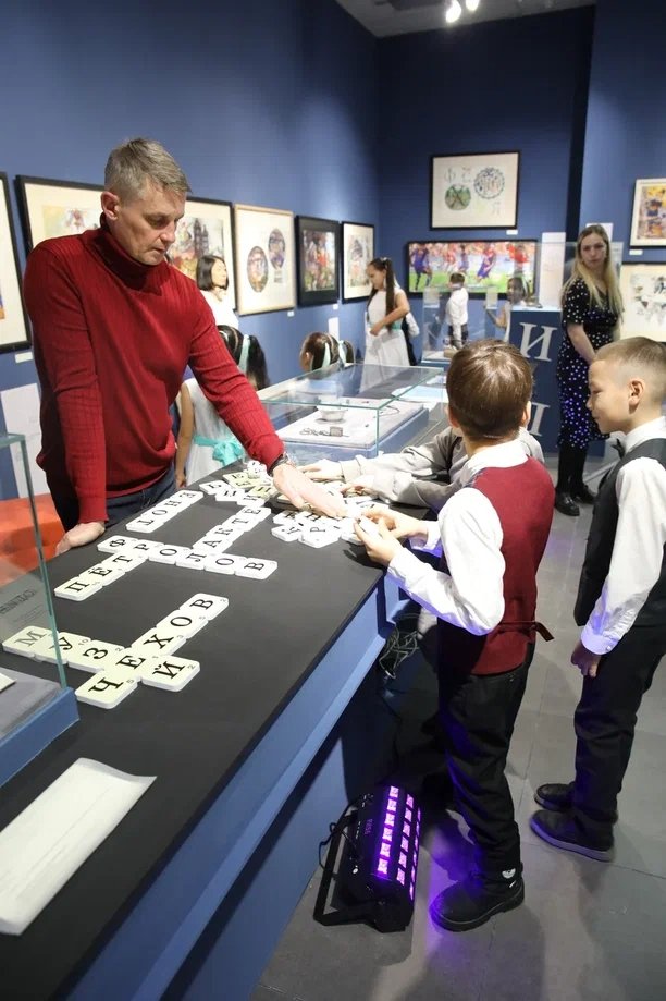 Выставка "Азбука" — это целый квест, который интересно проходить вместе с ребенком, рассказали в пресс-службе музея. Возле каждой картины с определенной буквой находятся пластиковая плашка и фломастер. Посетители могут найти на работе художника спрятанные слова, и записать их.