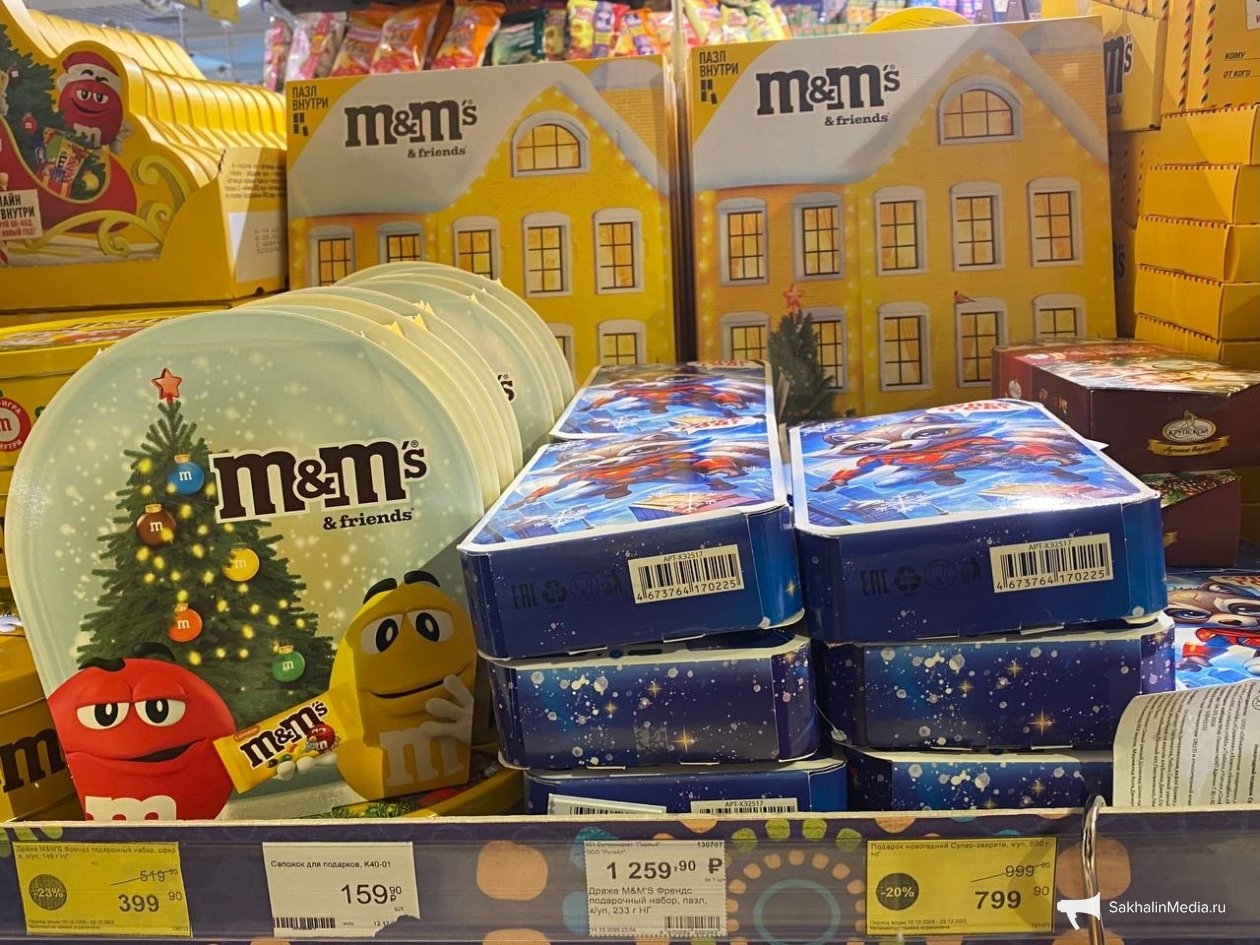 Так, покупателям предлагают наборы популярных шоколадных батончиков snickers, twix и других по цене от тыс. рублей, хотя самая большая граммовка — 262. Рядом находятся подарки от M&M’s — здесь разброс цен от 520 рублей за 148 г до 1,2 тыс. рублей за 233 г. Новогодние наборы от Kinder продаются в ценовом диапазоне 350-1,8 тыс. рублей (от 99 до 400 г), от Nuts — 500-900 рублей (от 250 до 442 г), от Toffifee — 670-1,3 тыс. рублей (от 250 до 375 г). Также найден подарок от бренда Milka, куда входит продукция других производителей — его стоимость составляет 1,3 тыс. рублей за 388 г.