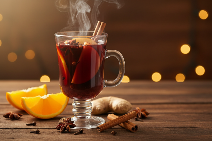 Безалкогольный глинтвейн имеет насыщенный цвет, который зависит от выбранного сока: красный при использовании виноградного или гранатового сока, тёмный при вишнёвом, светло-коричневый при яблочном. Аромат напитка выраженный благодаря специям, которые при нагревании полностью раскрываются и наполняют помещение праздничным запахом. Вкус сладко-терпкий, с небольшой горечью от гвоздики и тепличным послевкусием от имбиря и кардамона.