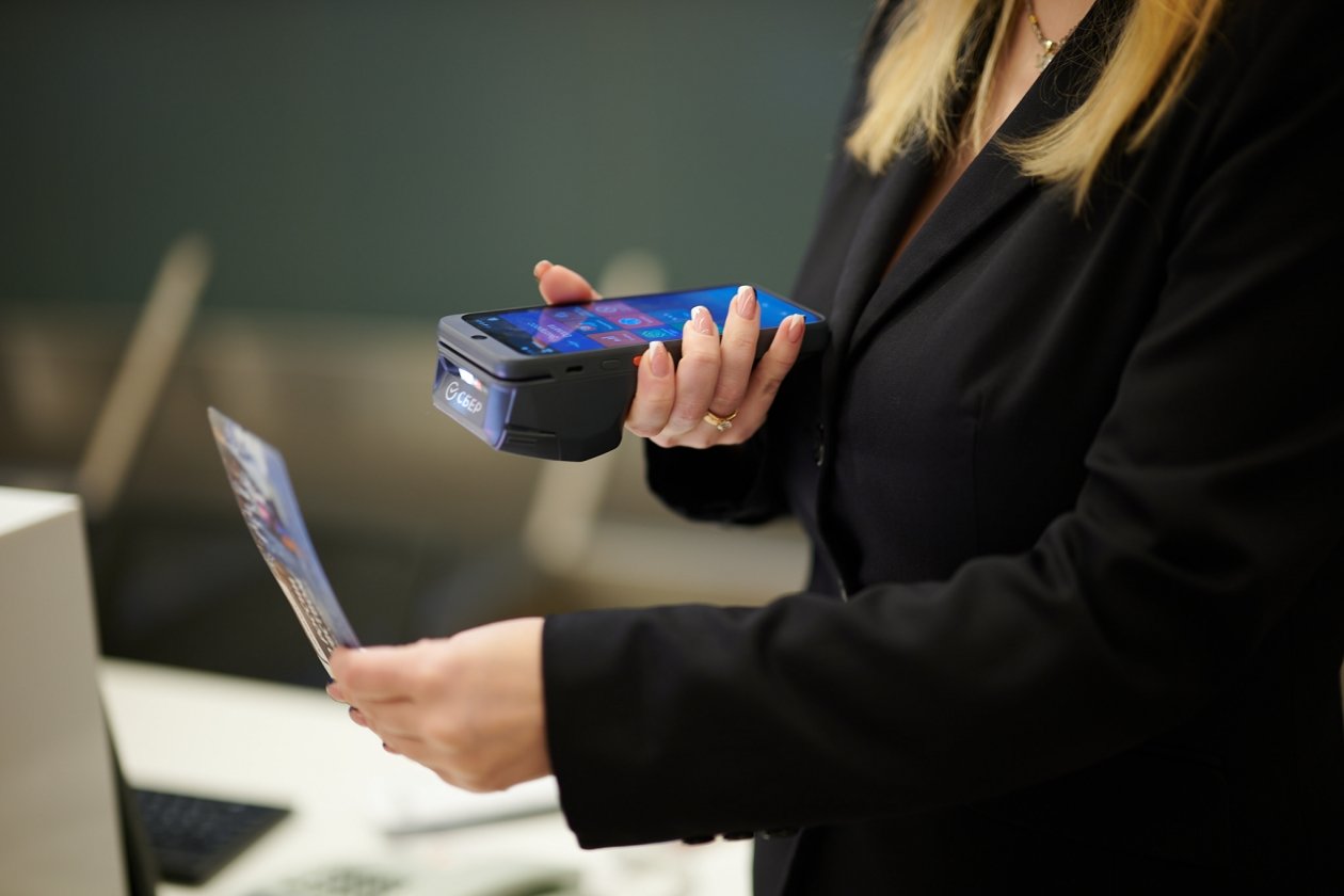 Сотрудник аэровокзала выбирает необходимый сервис и запускает оплату. Пассажир может оплатить услугу картой МИР любого банка. Устройство распечатывает квитанцию или отправляет ее на электронную почту.