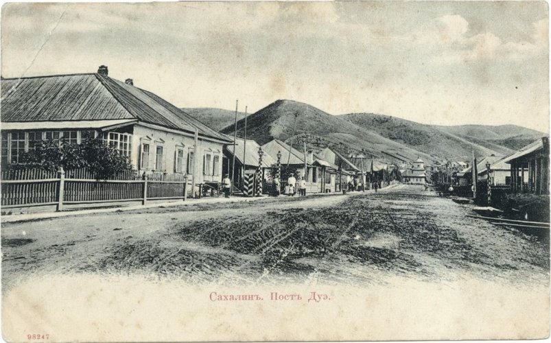 Местные жители на главной улице поста Дуэ. Сахалинская каторга: Вторая половина XIX – начало XX века. Фото: ЦГАКФФД СПб. П 643 сн. 22. Фото - И. И. Павловский