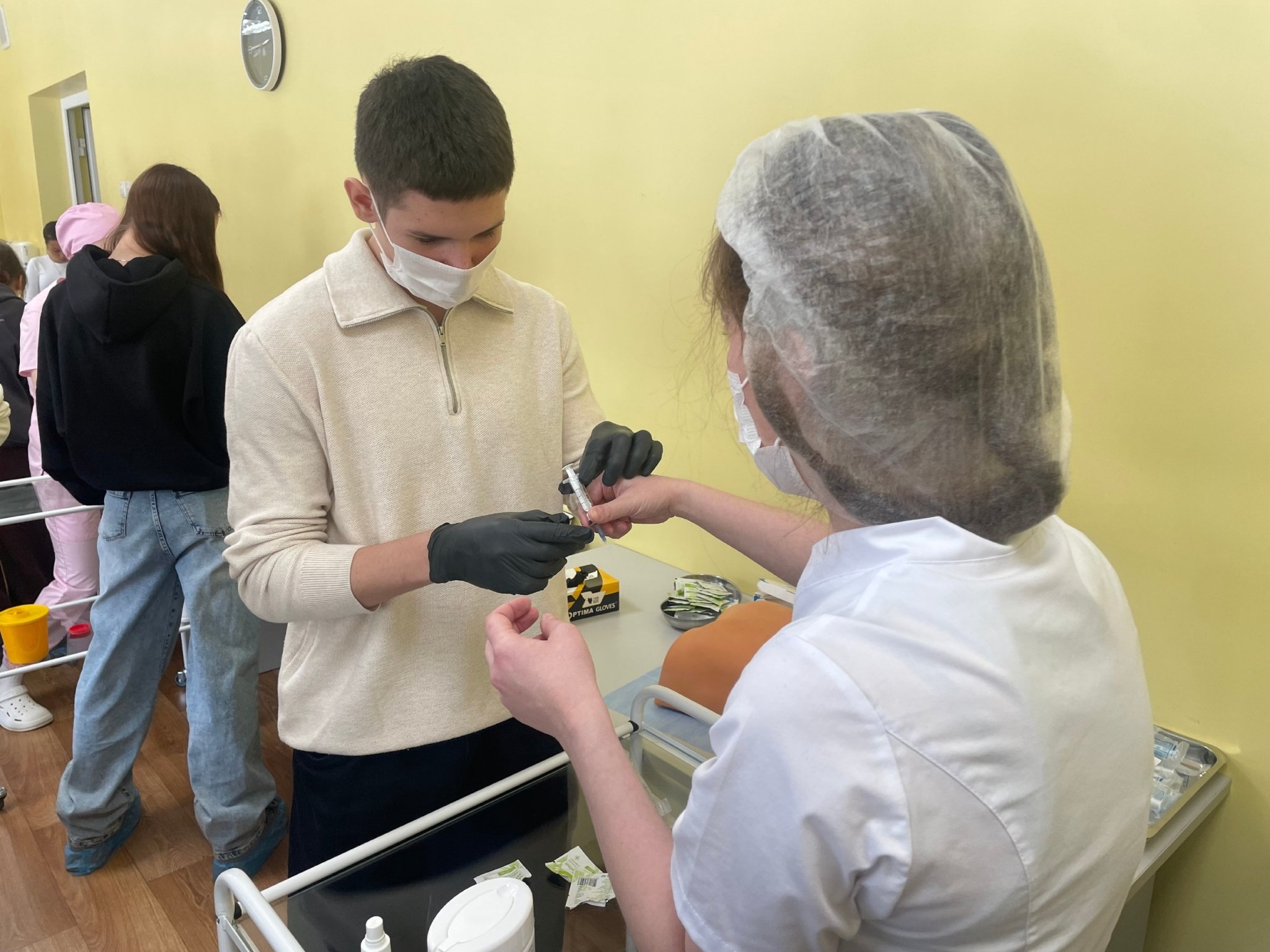 На всех этапах ребят сопровождали студенты медколледжа. Они не только помогали осваивать новые навыки, но и делились собственным опытом, демонстрируя полученные знания.