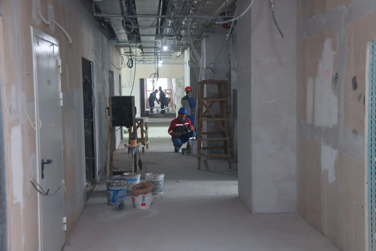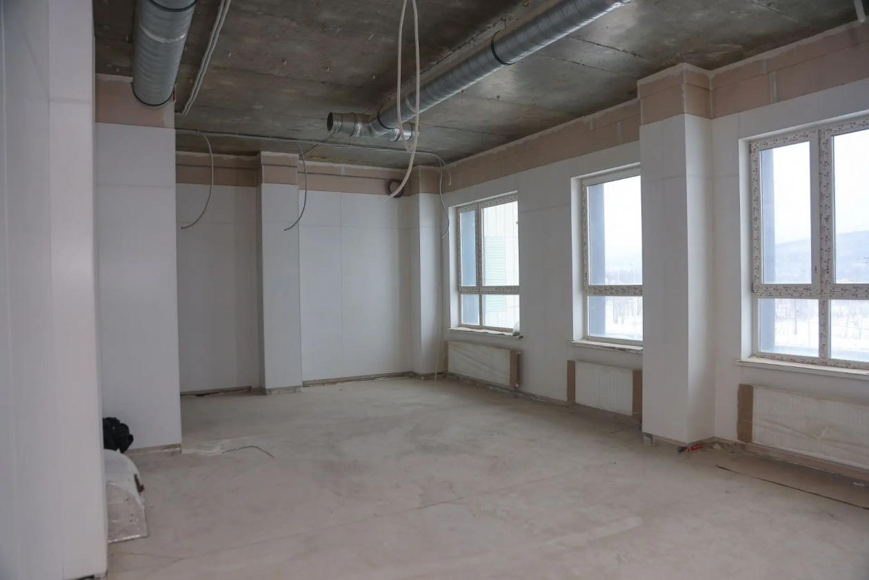 Техническая готовность здания составляет 65%. Сейчас в помещениях ведутся отделочные работы и монтаж внутренних электросетей.