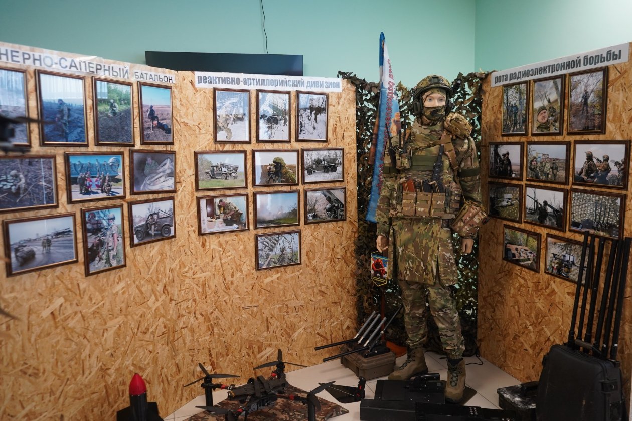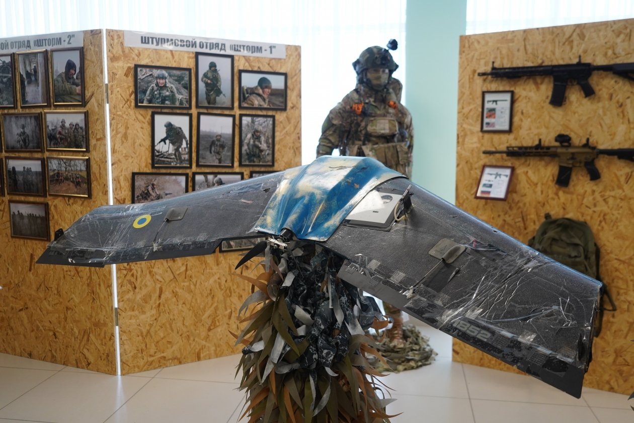 В экспозиции "Защищаем СВОих" представлены образцы охолощенного стрелкового оружия, средства радиоэлектронной борьбы российских военных и трофеи — автоматы, гранатометы и документы вражеских соединений и формирований. Также выставлены дроны.