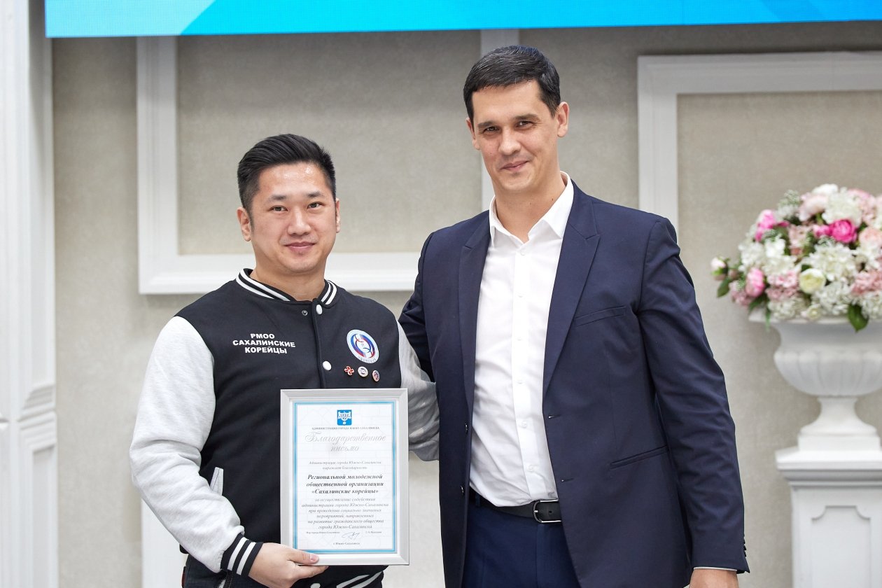 Благодарственные письма от администрации Южно-Сахалинска получили председатель региональной молодёжной общественной организации "Сахалинские корейцы" Сергей Ли и директор НКО "ВИКТОРИЯ" И Мин Дя.