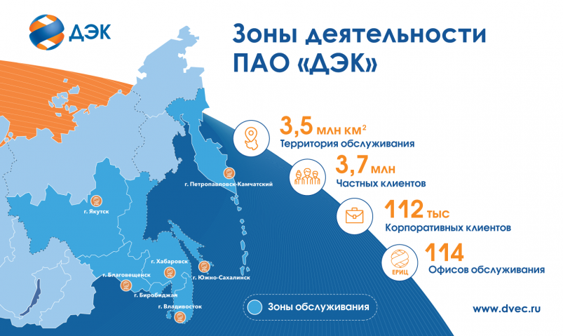 На сегодняшний день ДЭК — крупнейшая энергосбытовая компания России по территории обслуживания. ДЭК обслуживает свыше 3,5 млн лицевых счетов частных и 112 тыс. корпоративных клиентов. Очные консультации ведутся в 114 офисах от Сахалина до Якутии.