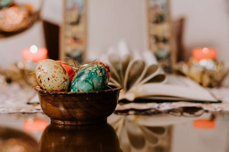 9. Мраморные пасхальные яйца, окрашенные в рисе, готовы. Для блеска смажьте их растительным маслом.