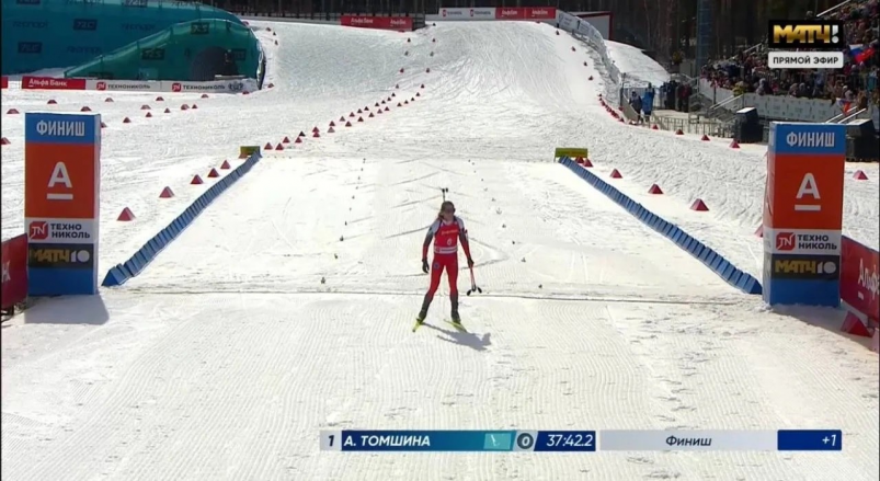 Заключительная стойка проходила в сложных погодных условиях: сильный порывистый ветер мешал спортсменкам. Однако Томшина выдержала паузу и уверенно закрыла все мишени. Эта победа стала для нее первой на чемпионате страны.