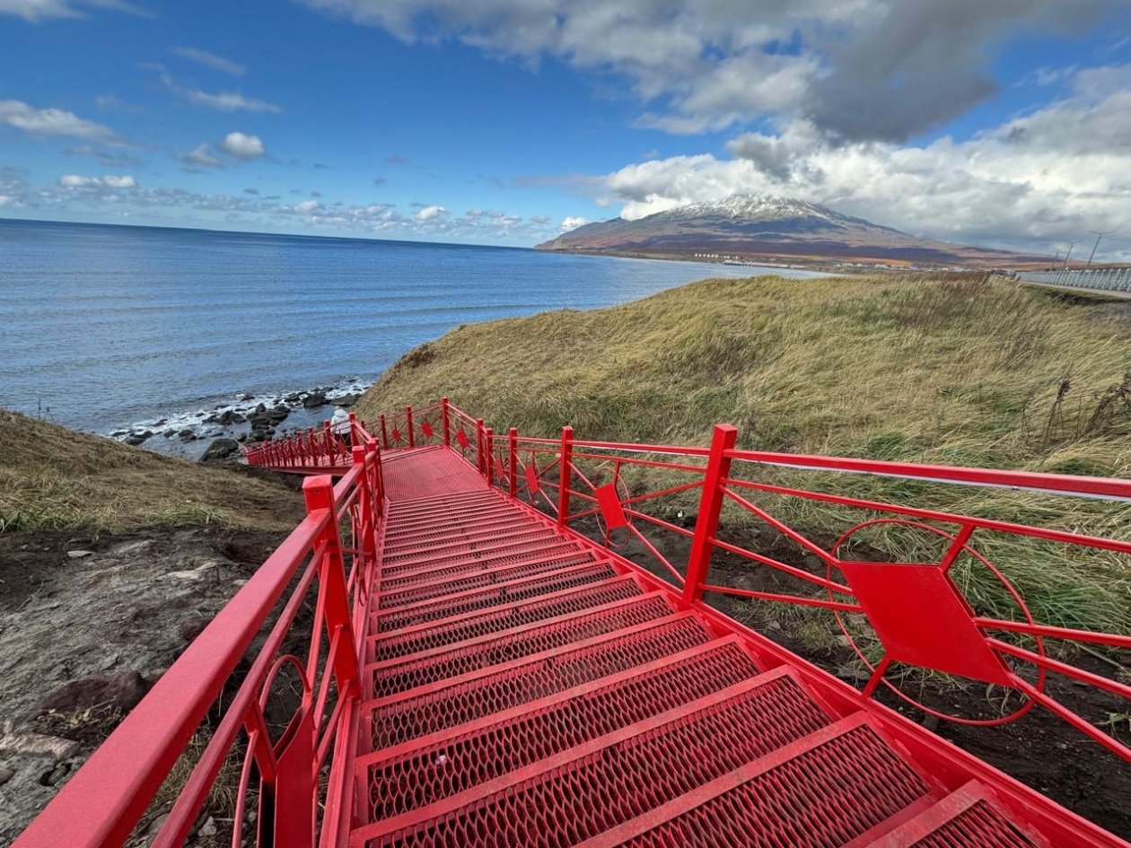 В Южно-Курильске по проекту "Спящая красавица" обустроили пешеходную лестницу со смотровыми площадками, зоной отдыха с навесом и качелями, обновили освещение и озеленение. Здесь появились площадки для йоги, воркаута и амфитеатр. Учитывая островной климат и агрессивное воздействие морского воздуха, принято решение дополнительно обработать металлические конструкции антикоррозийным составом и обновить облицовку навесов.
