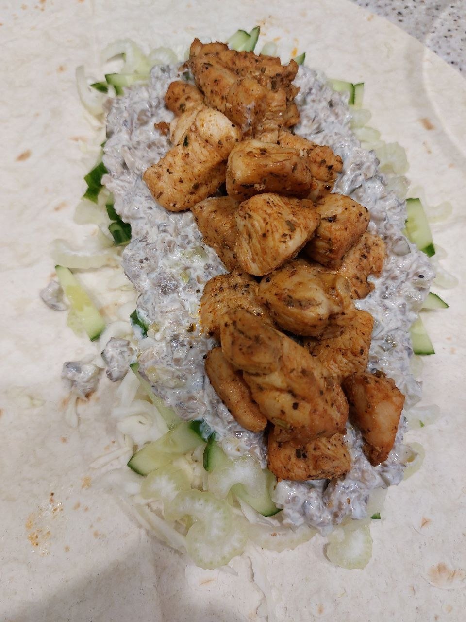 На тонкий лаваш выкладываем слоями: курица, грибной соус с огурцами и свежие овощи. Пропорции можно подбирать по вкусу.