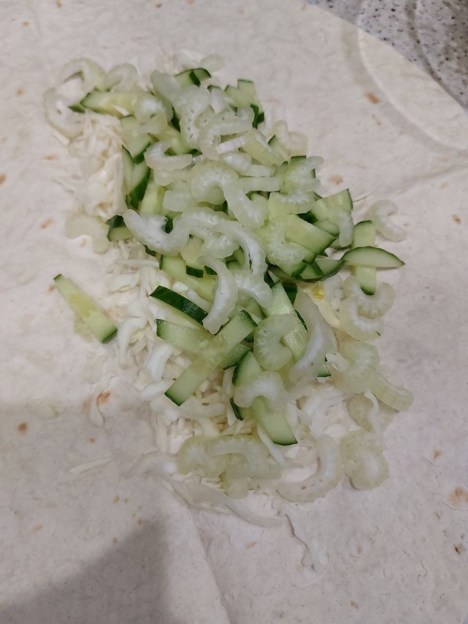 "Моя семья обычно ест шаурму только в кафе, но этот рецепт стал нашим фаворитом. Сельдерей и капуста дают хруст, а грибы почти заменяют майонез — лёгкая, но вкусная версия".