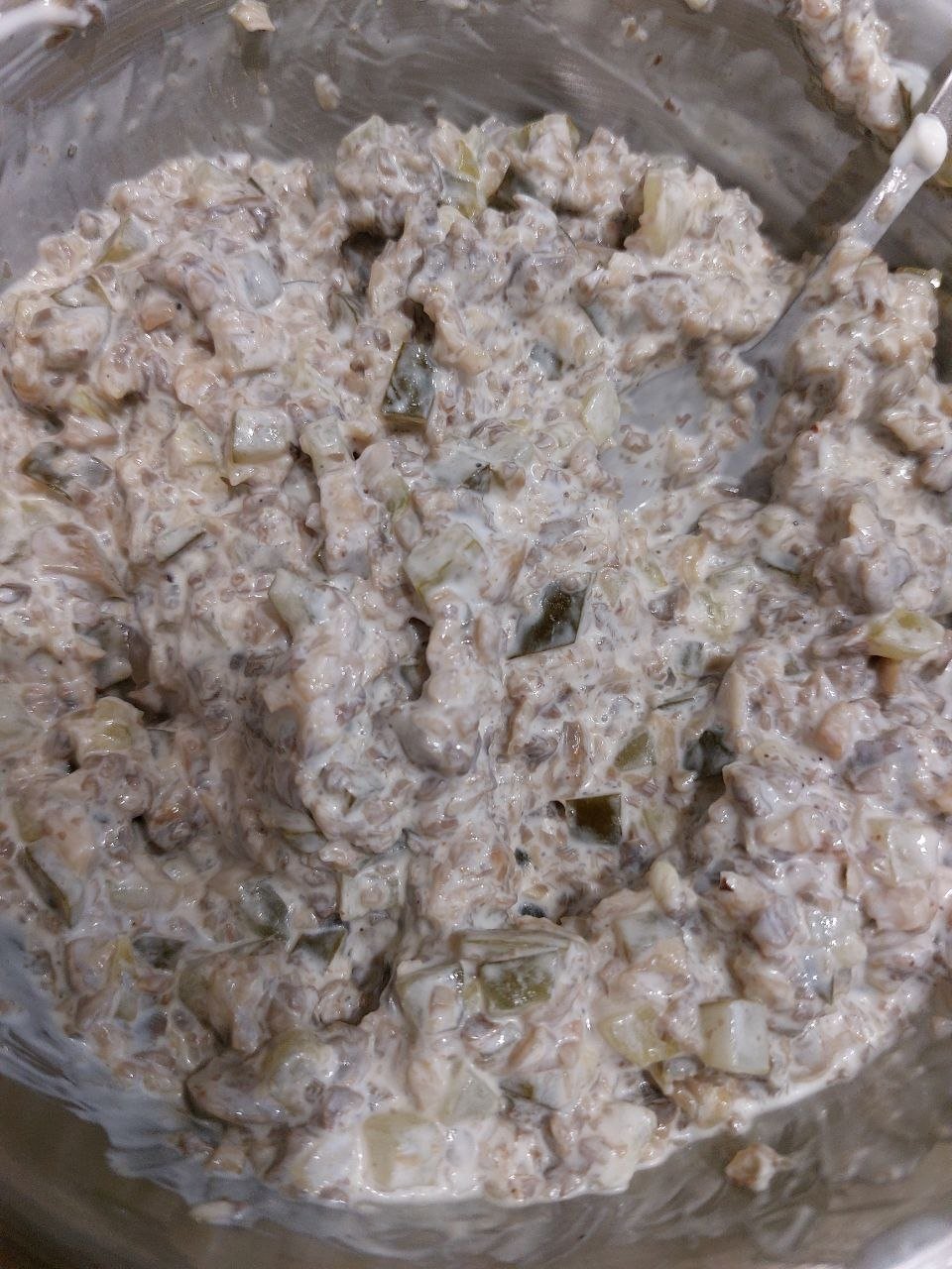 Для соуса смешиваем грибы с огурцами, добавляем греческий йогурт или сметану (10%). Солить и перчить дополнительно не обязательно — грибы и огурцы дают достаточно вкуса.