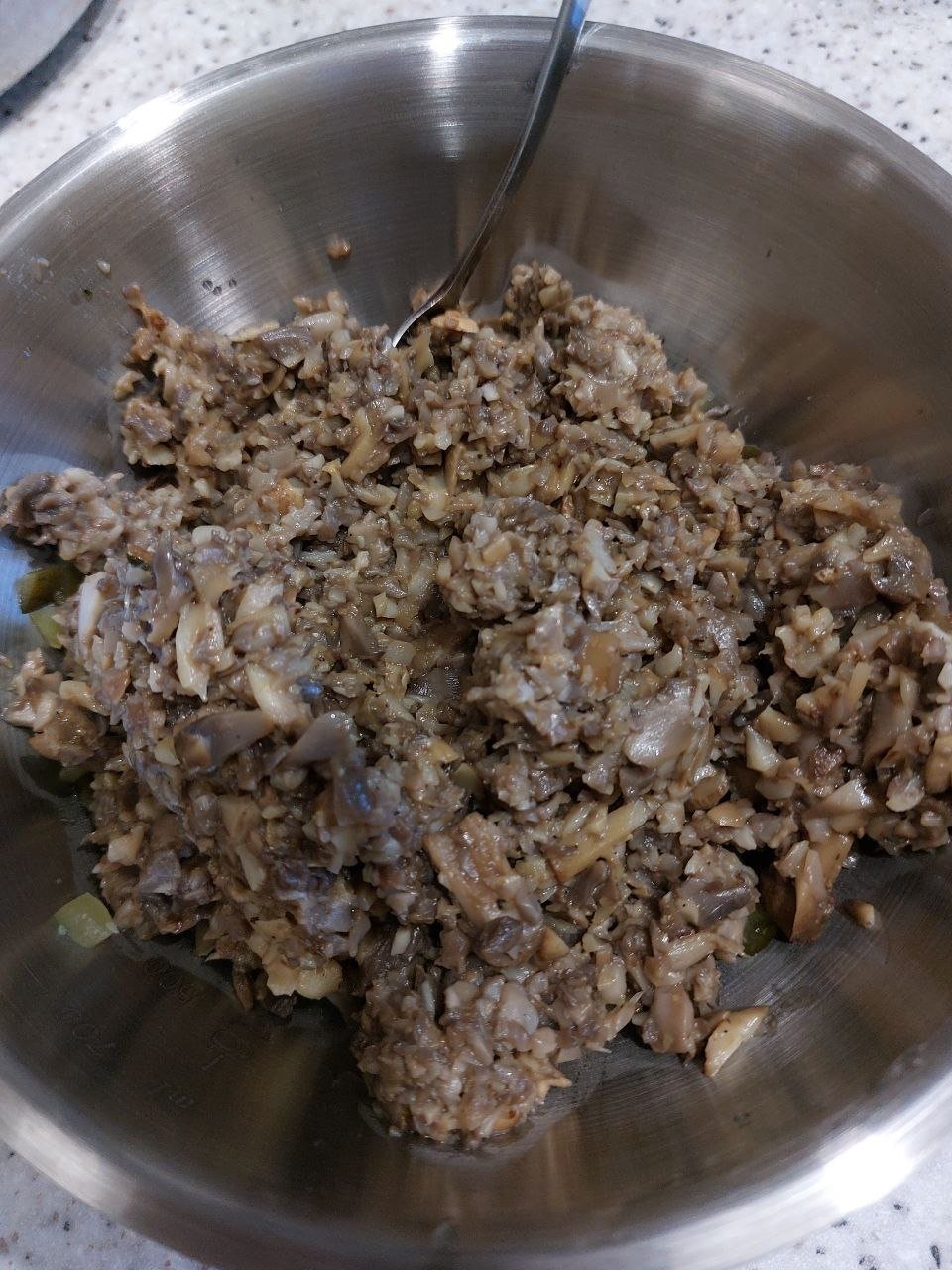 Грибы и курицу готовим отдельно. Можно слегка обжарить на сковороде или запечь в духовке. После обжарки грибы измельчаем блендером до мелких кусочков.
