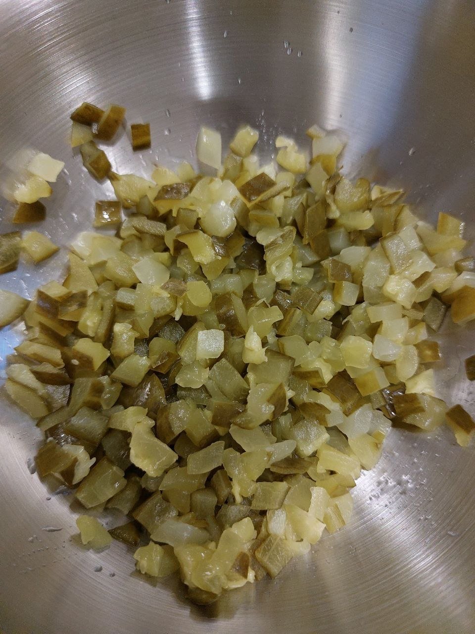 - Огурцы — нарезаем маленькими кубиками, лишнюю жидкость отжимаем.