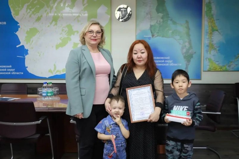SakhalinMedia, 31 марта. Мэр Корсаковского МО Наталия Куприна вручила жилищный сертификат многодетной семье, где воспитываются трое детей. Об этом она рассказала в своем telegram-канале (18+).
