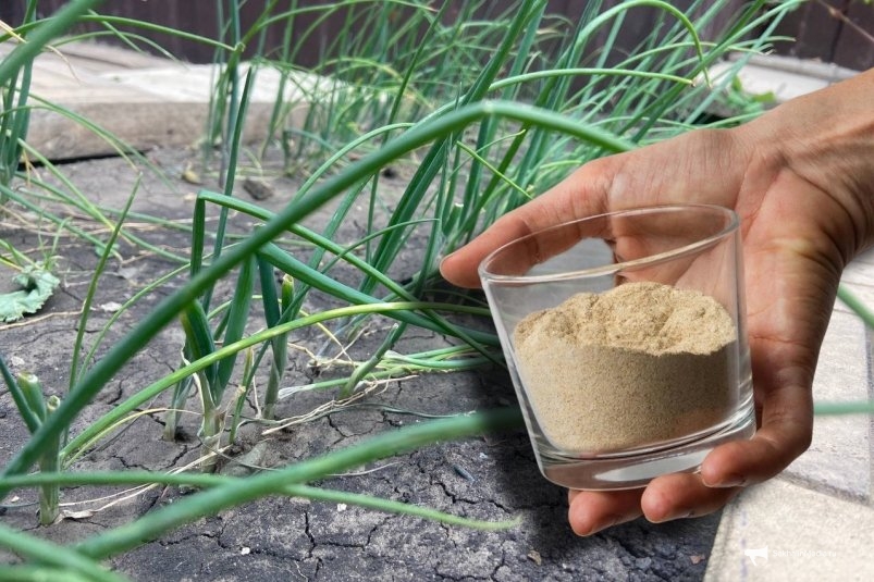 Третья подкормка — в фазе формирования луковицы. Готовят раствор сульфата калия (столовая ложка на 10 литров воды) или снова используют настой золы. Калий отвечает за налив и плотность головки.