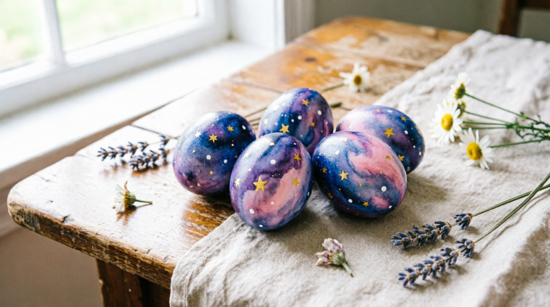 Результат будет космическим: яйца заиграют всеми оттенками галактики. А на каждое уйдет всего 5–7 минут. И никаких художественных навыков не понадобится, только немного терпения и обычные пищевые красители. Так что даже ребенок справится.