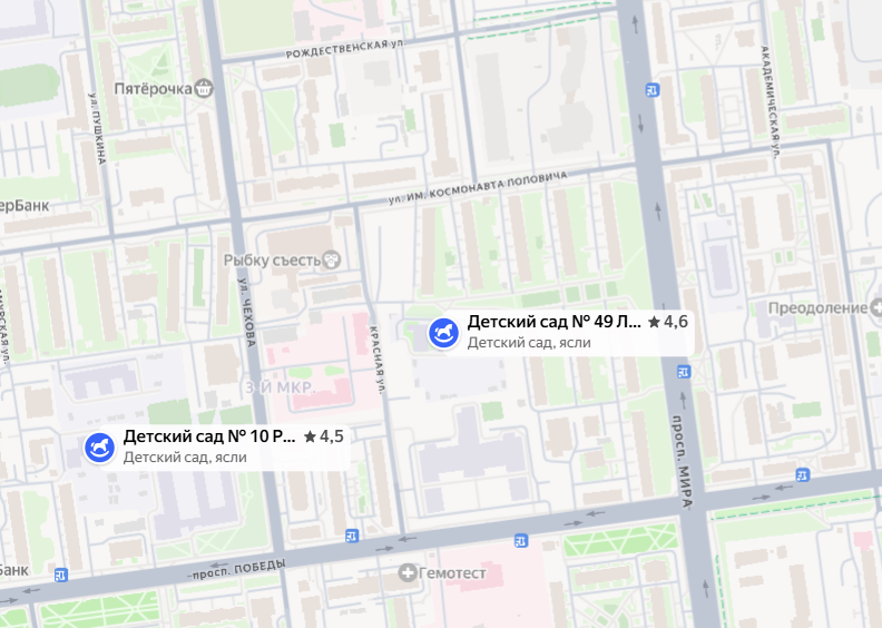 С инфраструктурой здесь уже сложнее из-за удаленности ЖК от основной части города. Так, две ближайшие школы находятся на равноудаленном расстоянии от "Зеленой планеты", и в обоих случаях путь туда на автобусе займет около 40 минут. Но повезло жителям ЖК с детским садом — до ближайшего идти примерно 15 минут пешком.