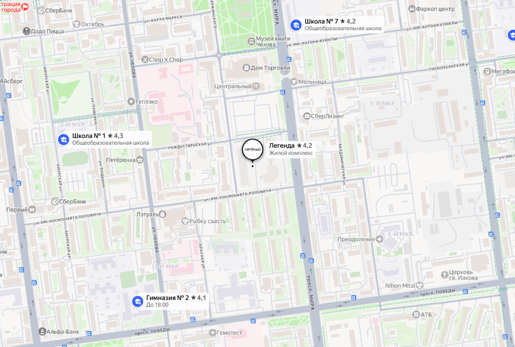 Жилой комплекс ЖК "Легенда" от застройщика "Главстрой-Регионы" и ЖК "Рождественская 63" от ГК "Лиго" расположен в самом сердце Южно-Сахалинска, буквально в пяти минутах ходьбы находится Дом правительства Сахалинской области и основные учреждения культуры и образования: Чехов-центр, Театр кукол и СахГУ.