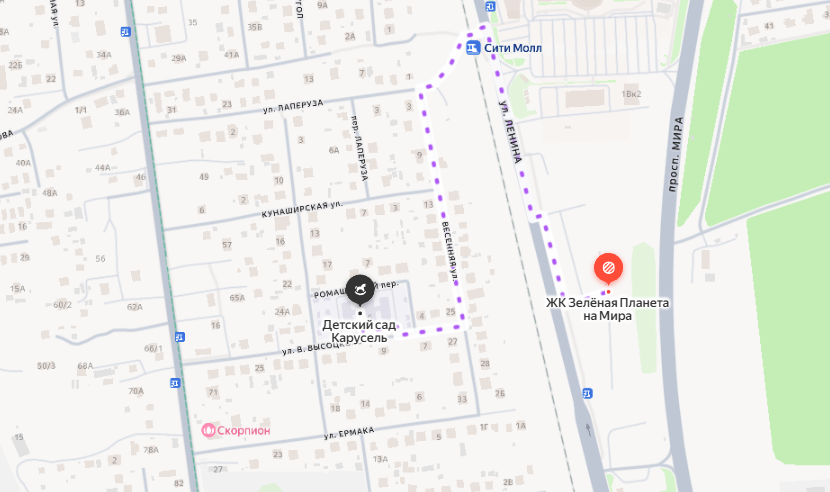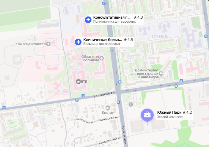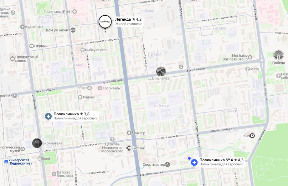 С поликлиниками в районе вблизи ЖК ситуация спорная. Чтобы попасть к врачу, жителям "Зеленой планеты" нужно проделать путь до горполиклиники №4, но он займет около 20 минут что на автобусе, что пешком — а идти придется практически по обочине, вдоль улицы Мира. Рядом строится поликлиника в Хомутово, которую обещают открыть уже этой осенью — туда путь чуть короче (около 15 минут), но все еще пролегает по дороге почти без пешеходной зоны.
