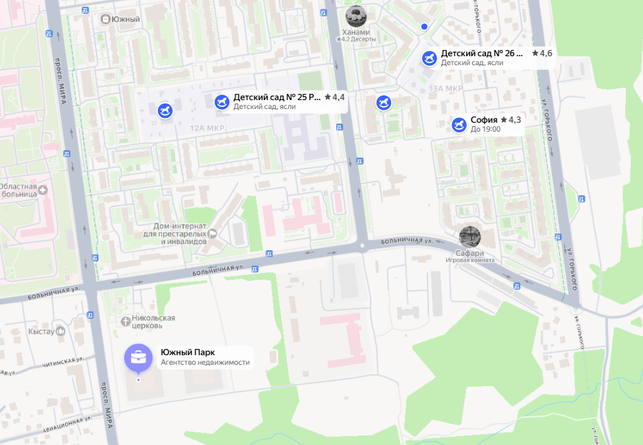 С детскими садами здесь похожая ситуация, что и со школами — все учреждения находятся примерно в одном районе. Так, путь до ближайшего детсада составит около 10 минут. Обратиться к врачу в поликлинику жителям "Южного парка" тоже будет весьма просто: в 10 минутах ходьбы находится областная больница и консультативная поликлиника.