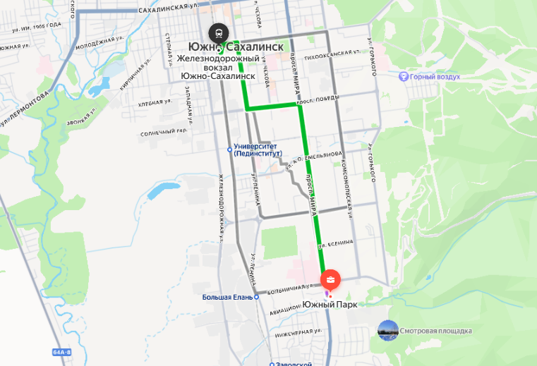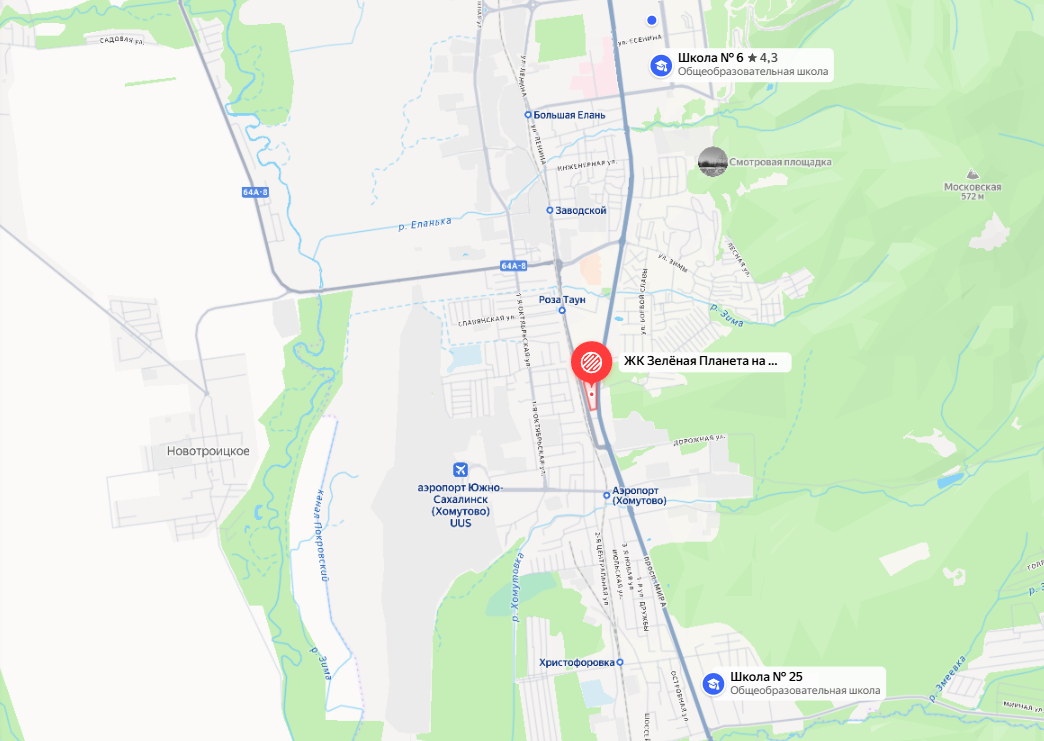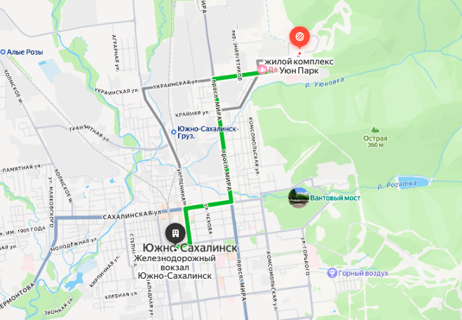 Этот жилой комплекс, строящийся силами ООО СЗ "СахалинДом", расположен практически на выезде из делового центра города, возле улицы Больничной. Чтобы добраться от него до Ж/Д и автовокзала, придется проехать на автобусе — маршрут займет около получаса. Судя по расписанию, автобусы ходят каждые 15 минут.