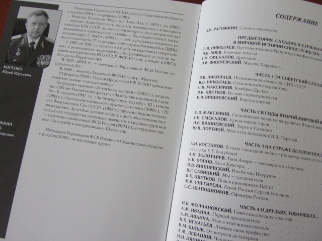 В книге использованы материалы и фотографии из фондов Центрального архива министерства обороны РФ, Государственного исторического архива Сахалинской области, Государственного архива по личному составу УФСБ Сахалинской области, научного архива Сахалинского краеведческого музея, Хоккайдского университета, а также из семейных фондов бывших руководителей сахалинских органов безопасности, сообщает РИА SakhalinMedia.