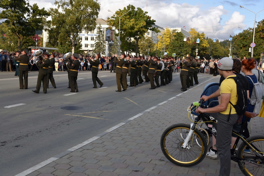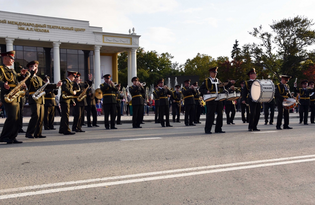 Вначале оркестранты прошагали от краеведческого музея до площади перед Домом правительства. Затем состоялось красочное дефиле-парад военных оркестров. А через час в Чехов-центре прошел концерт специального гостя фестиваля – солиста Андрея Давидяна.