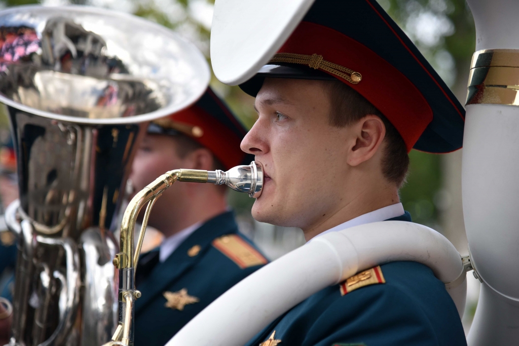Музыканты оркестра штаба Восточного регионального командования ВВ МВД России, образцово-показательного оркестра Генерального штаба вооруженных сил Монголии, военного оркестра Южно-Сахалинского гарнизона и военного оркестра штаба Центрального военного округа возложили цветы к Вечному огню Мемориала Славы в Южно-Сахалинске.