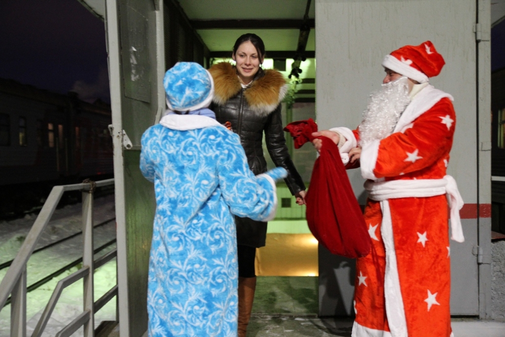 Сегодня на железнодорожном вокзале Южно-Сахалинска все сообщает о наступлении нового года. Яркие огни, мишура, елка и главные символы Нового года Дед Мороз и Снегурочка. Они пришли к пассажирам не с пустыми руками, а мешком подарков. Сахалинцы с оживлением отреагировали на приятный сюрприз. Дети рассказывали стихи и пели песни, взрослы тоже не отставали, и пускались в пляс. Затем дедушка и внучка отправились на перрон, где отходил поезд до Корсакова, сообщили ИА SakhalinMedia в пресс-службе Пассажирской компании "Сахалин".