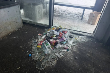 Вандалы разбили стекло и оставили кучу мусора на автобусной остановке в Невельске
