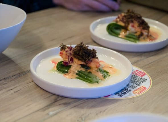 Сочетание сублимированной свеклы, сливы и лимонника стало главным акцентом первого блюда в исполнении шефа. Завершающим штрихом в этой композиции вкусов стали сушеные цветы калужницы. По словам мастера, такая холодная закуска удивит гостей эклектикой кислых ягод. В качестве второго "курса" гостям продемонстрировали способ приготовления лапши-рыбы во фритюре, которую подают в хрустящих шариках из теста под соусом "сябу-сябу".