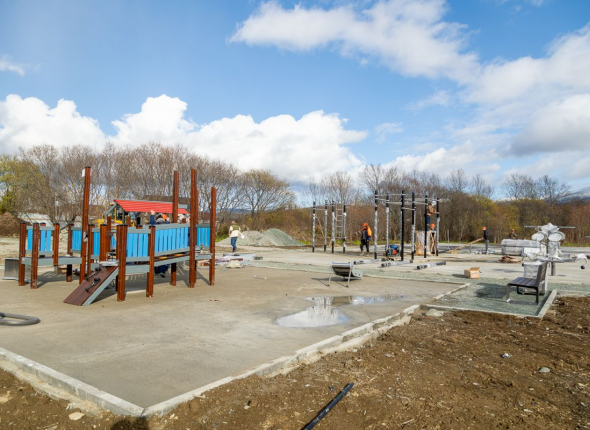 Строительство спортплощадки в Луговом. Фото: пресс-служба администрации Южно-Сахалинска