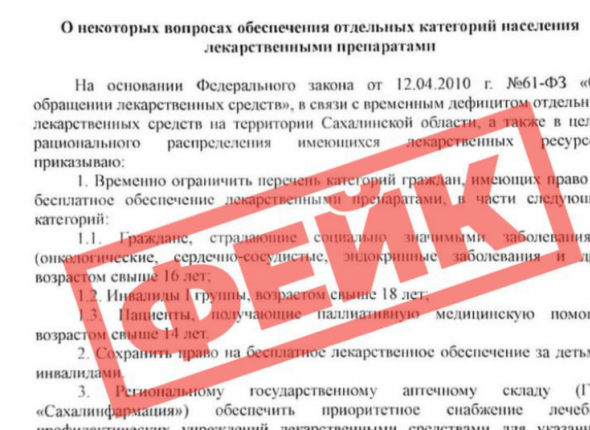 SakhalinMedia, 7 ноября. Очередной фейк в социальных сетях распространяется на Сахалине. Специалисты Центра управления регионом зафиксировали инфополе поддельный приказ министерства здравоохранения области, который якобы ограничивает обеспечение людей льготными лекарствами, сообщили в пресс-службе ЦУР.