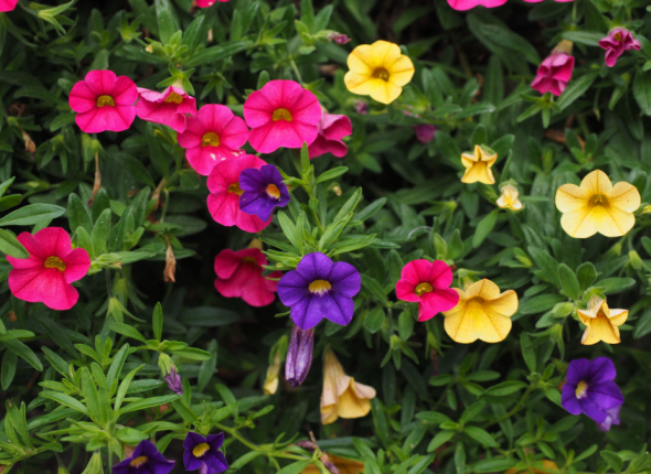 - калибрахоа. Это менее популярная мини-петуния, которая имеет более мелкие, но такие же яркие и красочные цветки. Это еще более терпеливая сестра петунии, которая не боится дождя и ветра. Цветет без остановки до заморозков, не вытягивается и сама формирует аккуратный куст. Лучше высаживать в кашпо;