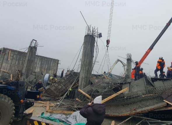 Ангар рухнул в переулке Энергетиков, 3А. Предварительно, конструкции упали во время заливки бетона на крышу сооружения. Спасательную операцию усложняет большое количество сырого бетона.