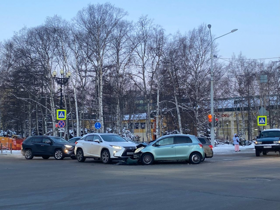 SakhalinMedia, 4 декабря. Три автомобиля попали в аварию в центре Южно-Сахалинска утром 4 декабря. Как передает корр. ИА SakhalinMedia с места событий, ДТП произошло на перекрестке "Коммунистический — Комсомольская" около 9.00.