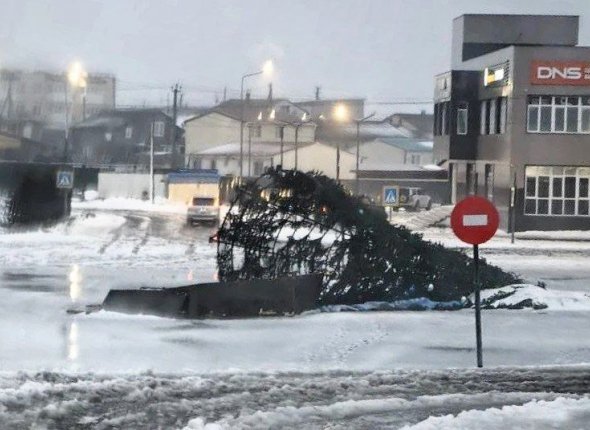 SakhalinMedia, 15 декабря. Из-за мощного циклона в Южно-Курильске на площади упала главная елка. Об этом пишут в местных соцсетях (18+).