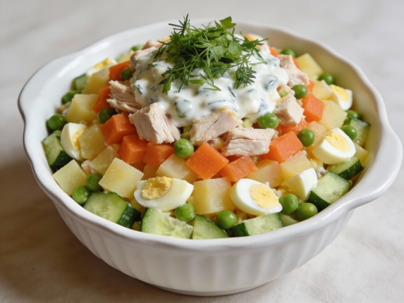 SakhalinMedia, 30 декабря 2025. Диетическое оливье содержит около 66 килокалорий на 100 граммов, что в четыре раза меньше классического варианта. Это блюдо обеспечивает организм необходимым белком, витаминами группы В и минералами при минимальном количестве жиров. По сравнению с традиционным оливье диетический вариант не вызывает чувства тяжести в желудке и лучше усваивается организмом.